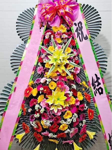 - 축하화환 – 개업식, 결혼식, 돌잔치, 공연·행사 등 축하의 의미를 담아 보내는 화환입니다. 색감이 화려하고 리본 장식이 포함되며, 개업 축하 문구나 결혼 축하 메시지가 함께 들어갑니다.